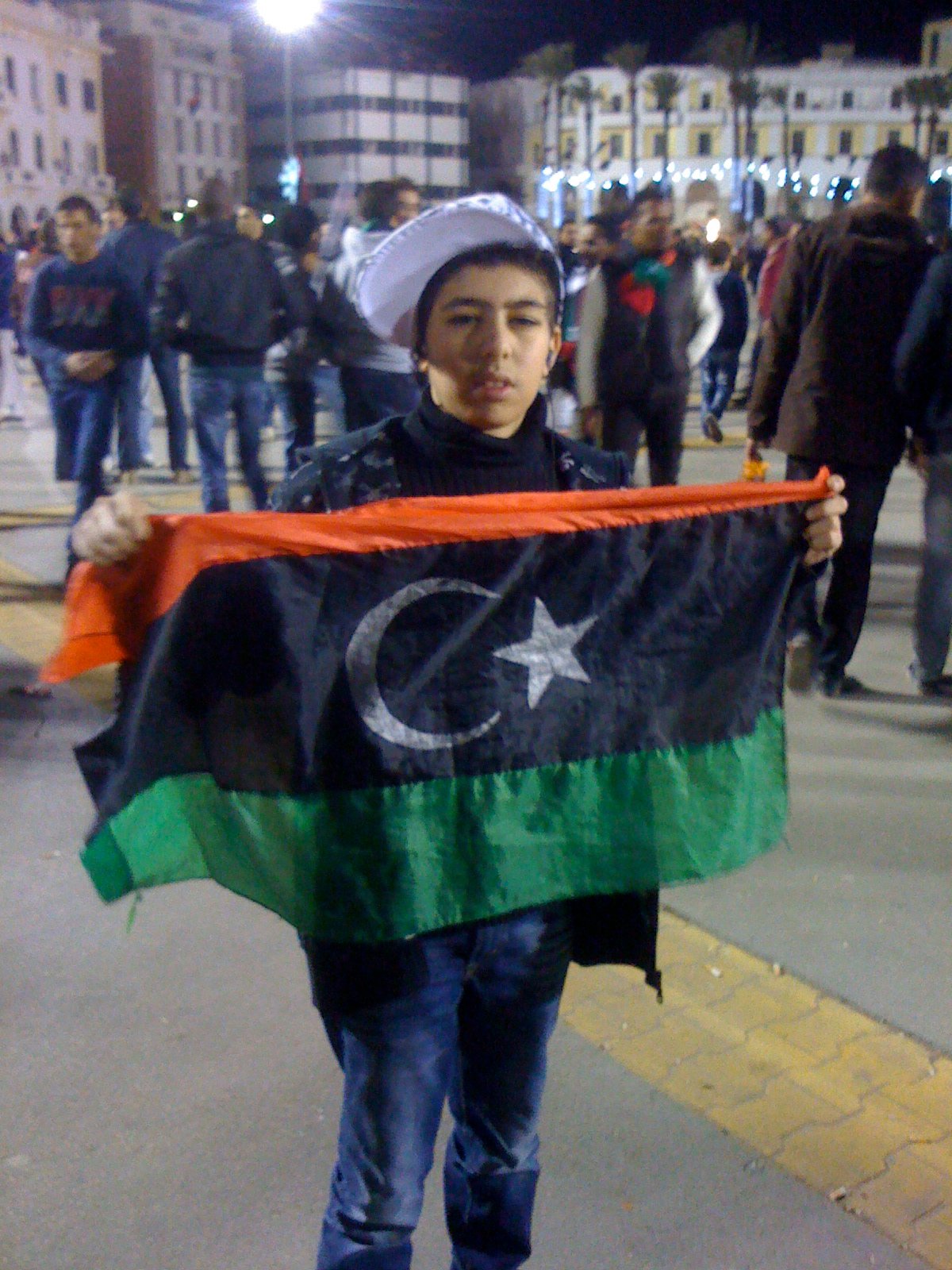 So the red is there to represent the blood of those thousands of earlier martyrs. The green symbolises everything the people fought for – their freedom and independence. The black with the crescent and star represents the Libyan people’s way of life – Islam. It more than represents Islam. The first black flag used for Cyrenaica was an actual piece of the black cloth that covered the Kaaba in Mecca, to which the crescent and star were added.