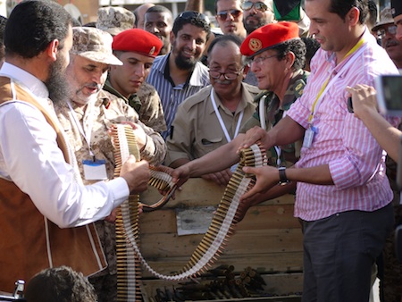 A large number of people have been voluntarily giving up arms at events organised by the national . . .[restrict]army at Benghazi and Tripoli. But considering the number of weapons circulating in Libya this event, although very welcome, seems to be a mere drop in the ocean. The more difficult challenge is to persuade people who do not believe in the revolution to give up arms. But although difficult, with the right balance of social pressure and recognition, it can be done.