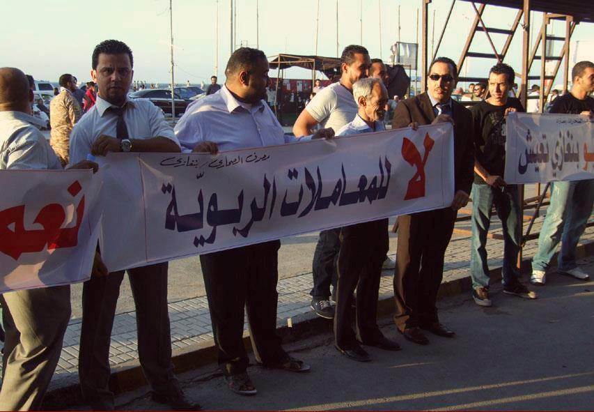 A number of employees of the . . .[restrict]Sahara Bank in Benghazi held a demonstration today outside the bank to protest against its use of interest. They demanded that it start using Sharia-compliant banking methods.