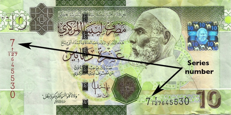 The series number is the first of the numbers on the front of the bank note.