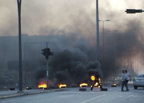 Young men set fire to tires in protest at the Bani Walid siege. (Photo: George Grant)