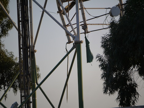“And look there”, says another member of the group, pointing towards a damaged pylon some 25 metres away. “Do you see? The green flag. The government has not seen it there, so nobody has taken it down”.