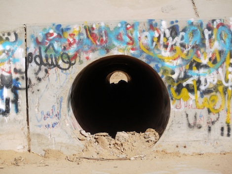 The drainpipe in which Qaddafi is said to have been discovered by Omran Shaban one year ago today. (Photo: George Grant)
