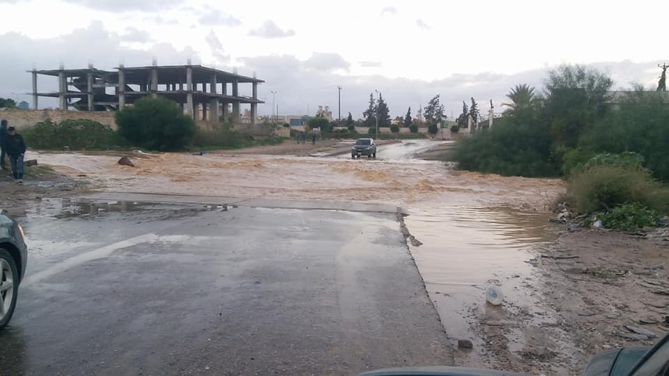 Water from the heavy rainfall has already made its way to Tripoli blocking the road in the Salah Al-Deen area where there is no bridge over the Wadi.