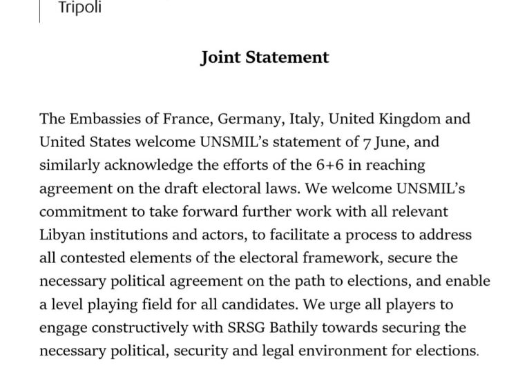 The Embassies of France, Germany, Italy, United Kingdom and United States welcome UNSMIL’s statement of 7 June, and similarly acknowledge the efforts of the 6+6 in reaching agreement on the draft electoral laws. We welcome UNSMIL’s commitment to take forward further work with all relevant Libyan institutions and actors, to facilitate a process to address all contested elements of the electoral framework, secure the necessary political agreement on the path to elections, and enable a level playing field for all candidates. We urge all players to engage constructively with SRSG Bathily towards securing the necessary political, security and legal environment for elections.