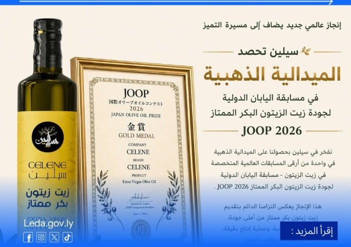 Libya’s Celene Olive Oil Company won a gold medal in the Extra Virgin Olive Oil Quality Competition at the Japan...